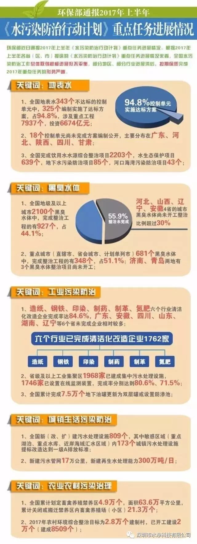 截至2017年6月底,全国地表水343个不达标的控制单元中,325个编制实施了达标方案,占94.8%,涉及重点工程7937个,投资6674亿元;18个控制单元尚未完成方案编制公开,主要分布在广东、河北、陕西、四川、甘肃。全国完成饮用水水源综合整治项目2203个,水生态保护项目639个,地下水污染防治项目85个,河口海湾污染防治项目43个。